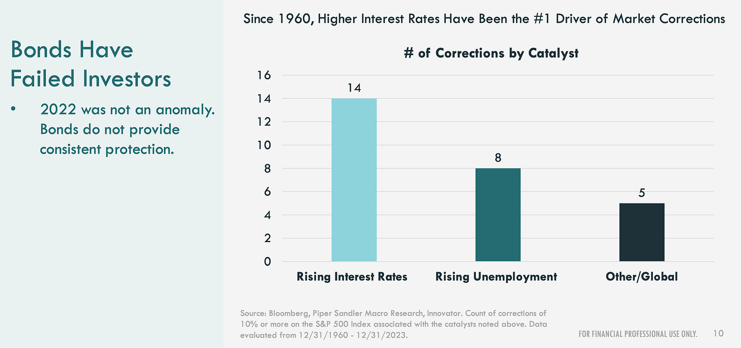 This week's first Chart shows that of the 27 drawdowns in the S&P 500 of greater than 10% since 1960, over half of them have been attributed to rising interest rates and rest to other factors. This week, we discuss the risk and return relationship between stocks and bonds and offer a middle ground that might provide more durable diversification for investor portfolios.