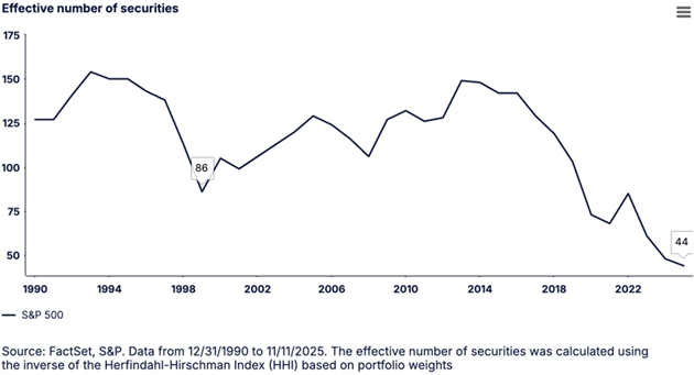 More strikingly, only about 44 names are driving the indexâs returns, the lowest effective number of contributors in roughly 35 years.