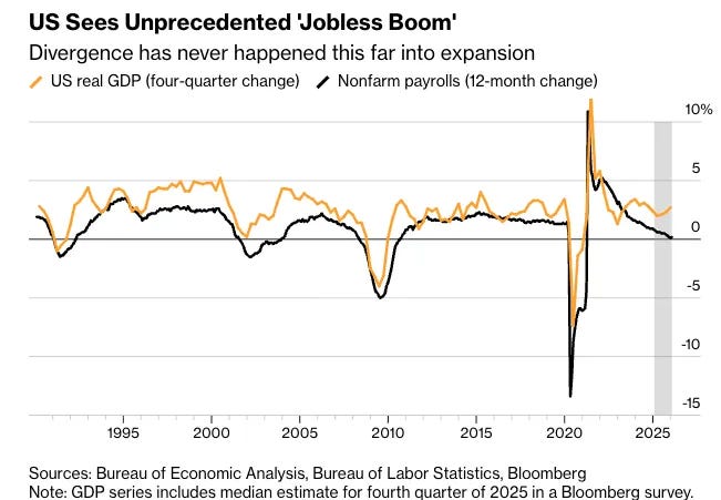 One mistake investors often make is assuming that economic progress and labor-market health move in lockstep. History suggests otherwise. Productivity can surge while job growth stalls.This week’s Chart shows just such an example: strong real GDP growth alongside weakening payroll gains deep into an expansion.