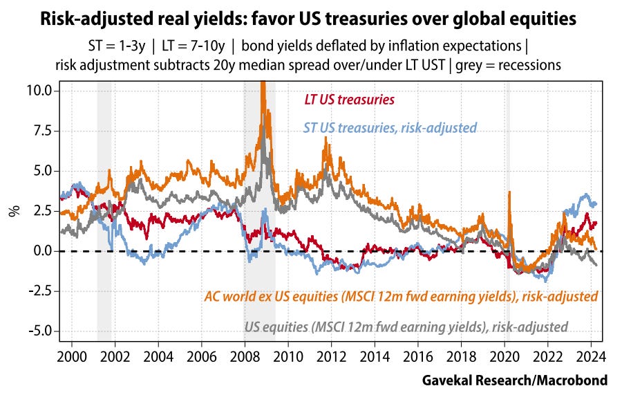 However, that is not what we see today. U.S. stocks offer a negative risk-adjusted real return. One could argue that the U.S. equity market is expensive because of the rich valuations on the Magnificent 7, actually now the Fab Four, but that doesnāt tell the whole story. Non-US equities are more attractively valued than U.S. equities but still offer no positive ERP.