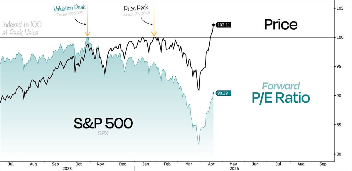 The S&P 500 is back at all-time highs. You’d be forgiven for assuming nothing has changed. But look at this week’s two Charts above and you’ll see something worth paying attention to: price is essentially where it was, but the forward P/E is not.