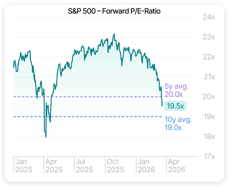 Heading into Q4 2025, the forward 12-month P/E stood at 22x, above both the 5-year average of 20x and the 10-year average of 19x. Today, it sits at 19.5x, roughly splitting the difference. That’s a meaningful compression in the multiple, driven almost entirely by rising earnings expectations.