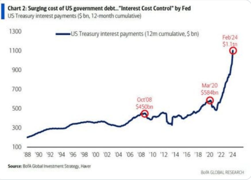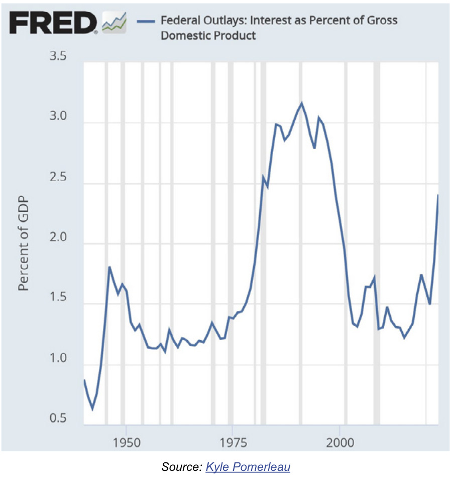 With record levels of U.S. federal debt, the government is also now faced with record levels of interest payments required to service that debt. Those interest payments have nearly doubled since the beginning of the pandemic, as shown in the chart above.