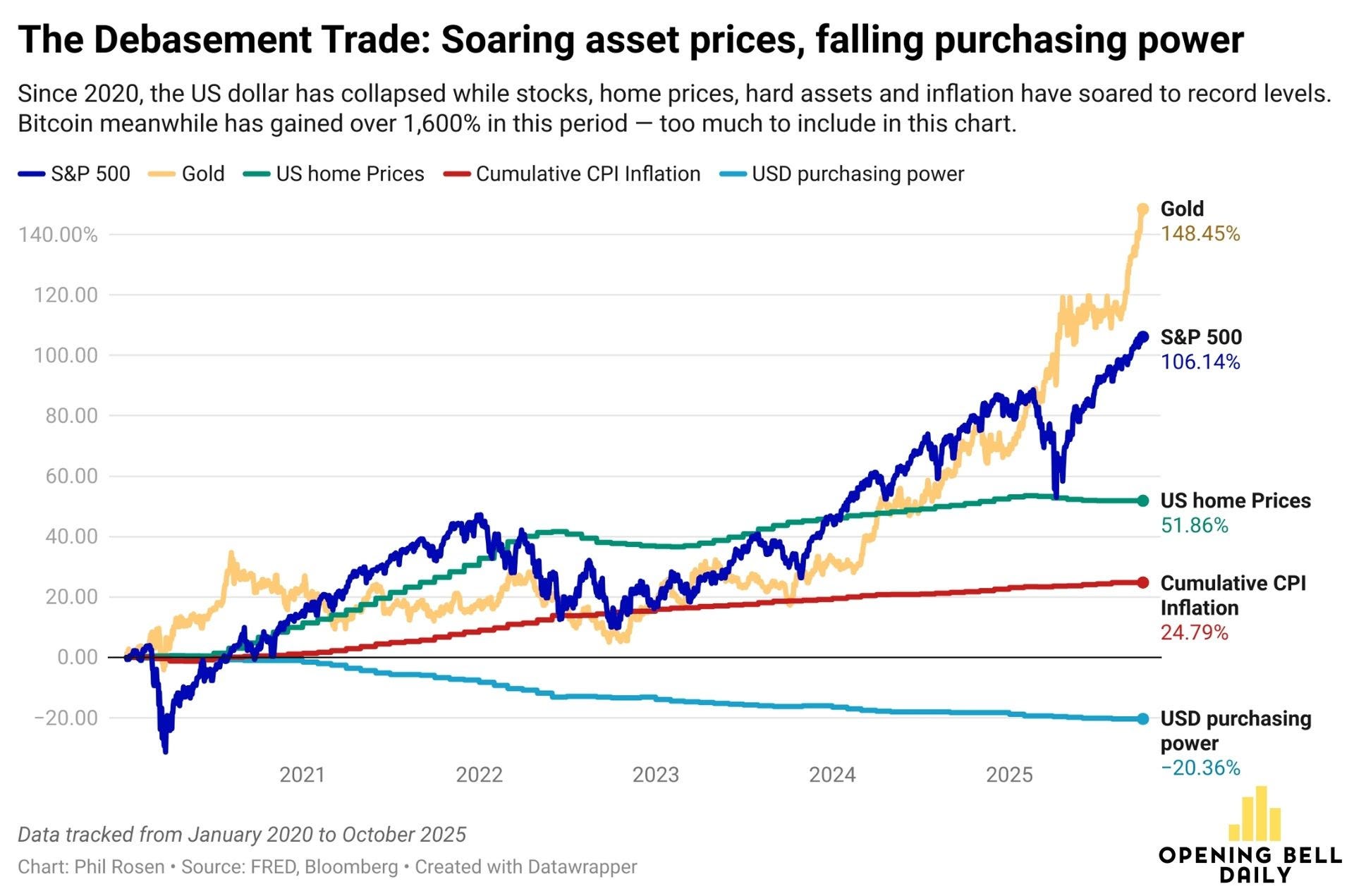 Since January 2020, gold has risen roughly 148%, the S&P 500 is up over 106%, and U.S. home prices have climbed nearly 52%. Over that same period, the purchasing power of the U.S. dollar has fallen more than 20%. Cumulative CPI inflation has risen just under 25%, but that understates the impact of debasement on real wealth. Asset inflation has far outpaced consumer price inflation.