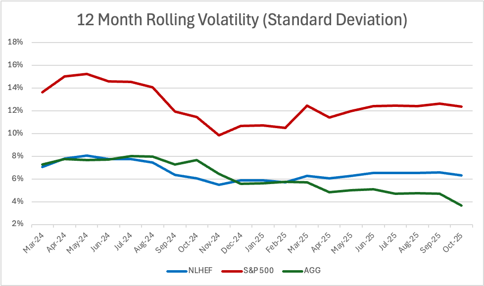 This weekās Chart shows the 12 month rolling volatility of the S&P 500, Bloomberg U.S. Aggregate Bond Index, and the New Lantern Hedged Equity Fund since the Fundās inception on April 1, 2023.