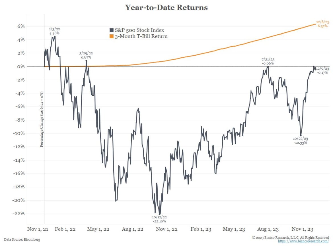 The above chart shows the rollercoaster ride to nowhere that the equity market has taken over the last two years as compared to the returns to 3 month treasuries, aka āthe risk-free rateā used in the calculations by which investors determine the value of all financial assets. Thatās pretty eye-opening on its own, in my opinion.