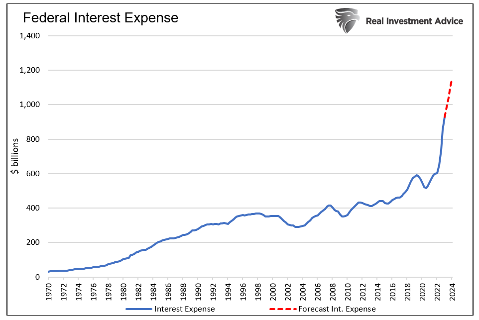 Total federal interest expenses should rise by approximately $226 billion over the next twelve months to over $1.15 trillion. For context, from the second quarter of 2010 to the end of 2021, when interest rates were near zero, the interest expense rose by $240 billion in aggregate. More stunningly, the interest expense has increased more in the last three years than in the fifty years prior.