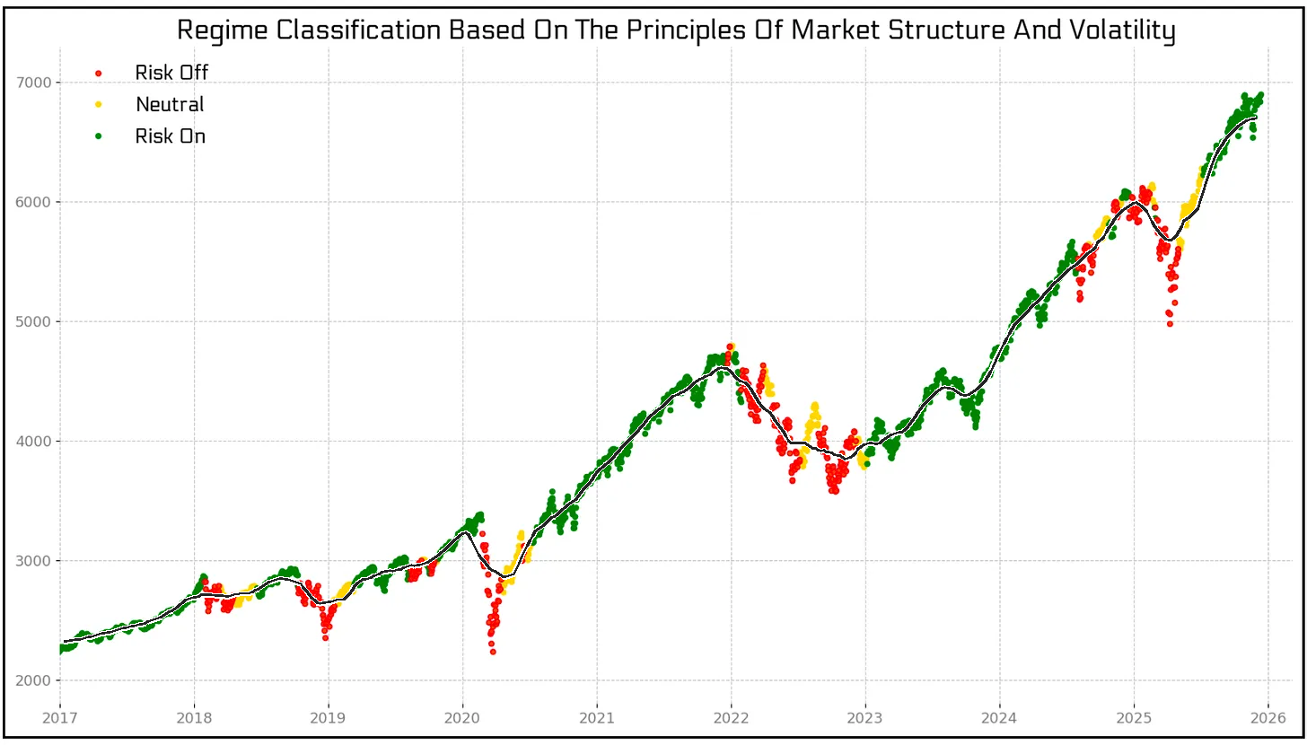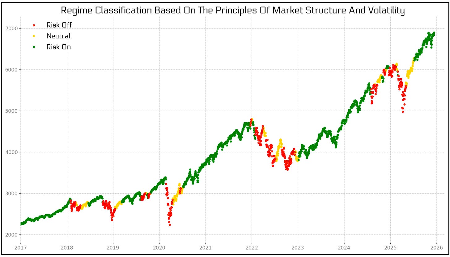 In this version of the Chart, what we see is intuitively obvious. When the environment is ârisk onâ (green), the equity market performs well, and vice versa when weâre in a ârisk offâ period (red).