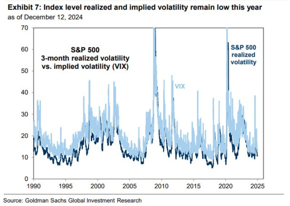 In the first Chart, we see that both realized volatility (actual market swings) and implied volatility (expectations of future swings measured by the VIX) are at historically low levels.