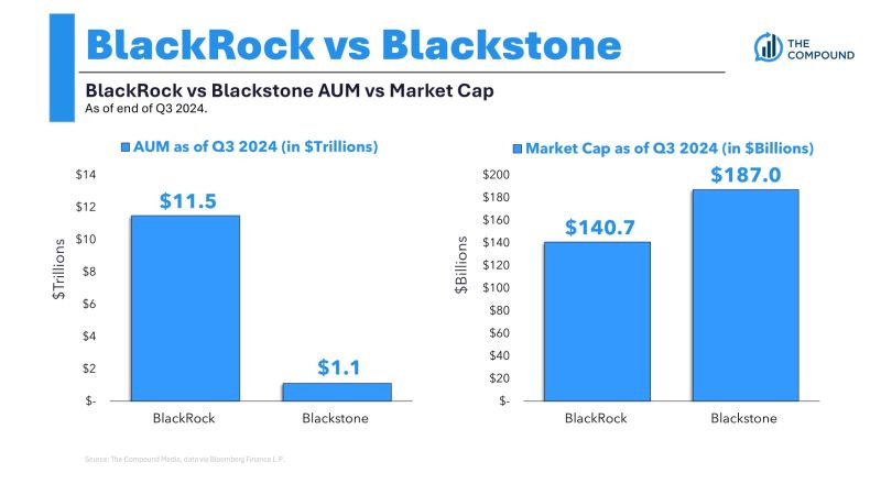 At first glance, the numbers in the Chart seem quite puzzling. BlackRock manages an eye-popping $11.5 trillion in assets as of Q3 2024āten times Blackstone's $1.1 trillion. Yet, Blackstoneās market cap ($187 billion) outstrips BlackRockās ($140.7 billion). Whatās going on here? Why does the market value private equity firms like Blackstone so much higher relative to their assets under management (AUM) compared to traditional asset managers like BlackRock?